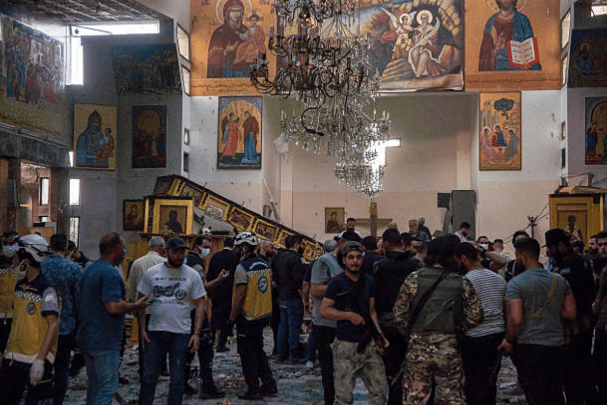 Damascenes inspect the damage after a suicide bomb attack on the St. Mar Elias Church on the outskirts of Damascus, Syria, on Sunday June 22, 2025. [Anagha Nair/Middle East Images via AFP]