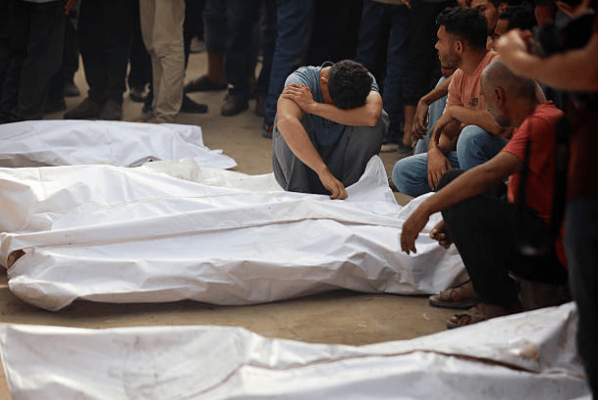 Palestinians mourn over their relatives killed during overnight Israeli airstrikes on the grounds of Al-Shifa hospital in Gaza City, Gaza Strip on Tuesday, July 1, 2025. [Photo by Majdi Fathi/NurPhoto via Getty Images]